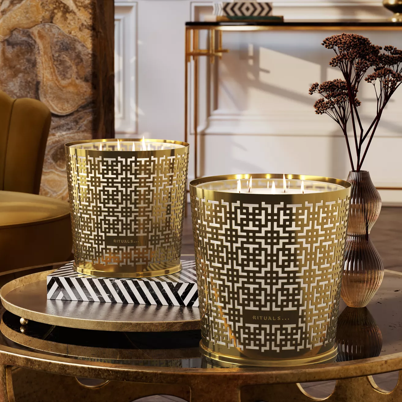 Luxusní, bohatě vonící svíčka na bázi černého oudhu, která vydrží zhruba 120 hodin. Hluboké tóny oudhu se nádherně snoubí s bohatým kořením a pudrovým pačuli a vytvářejí tak osobitý charakter. Bílé průsvitné sklo svíčky umožňuje mihotavému plameni krásně pronikat skrze vyryté výřezy kovového držáku. Po vyprázdnění lze opakovaně použitelný kovový obal nasadit na jakoukoli naši svíčku o hmotnosti 1600 g.