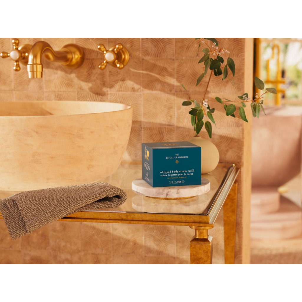 Zažijte omlazující sílu lázní hammam v pohodlí svého domova s kolekcí, která dokonale spojuje osvěžující a vyživující sílu arganového oleje, rozmarýnu a eukalyptu. Každý přípravek, od péče o domácnost až po péči o tělo, lahodí smyslům aromatickou směsicí eukalyptu a máty, aloe vera a santalového dřeva.