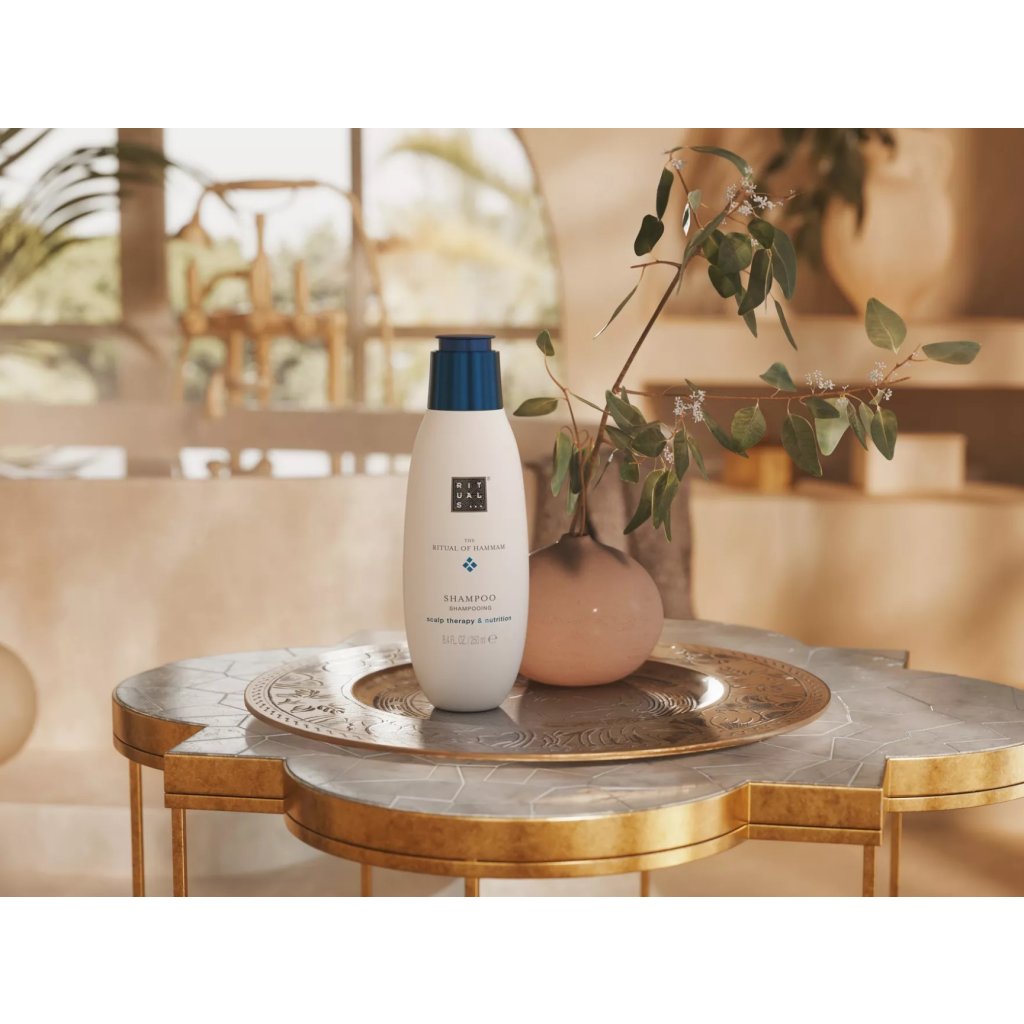 Očistěte a osvěžte své vlasy a pokožku hlavy šamponem The Ritual of Hammam, který vám zajistí čistou pokožku hlavy a zářivě zdravé a lesklé vlasy od kořínků až ke konečkům. Kombinace kofeinu a červeného ženšenu obnovuje rovnováhu pokožky hlavy, pomáhá vytvářet silnější vlasy, prodlužuje růstový cyklus vašich vlasů a stimuluje jejich růst. Výtažek z rýže a olej ze semen makadamie chrání, obnovuje rovnováhu a opravuje vlasy tím, že jim dodává extra vlhkost. Vhodné pro každodenní použití a všechny typy vlasů. Pro dosažení nejlepších výsledků používejte v kombinaci s kondicionérem ze stejné kolekce.