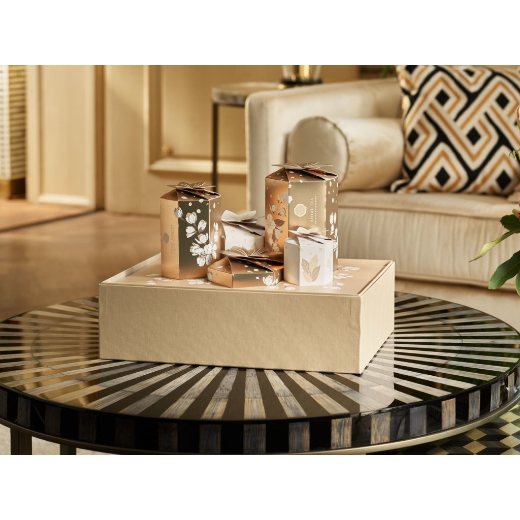 Uvnitř dárkového boxu najdete dvě papírové desky s přihrádkami. Nejprve sklopte dělící přepážky na zlaté desce a vložte ji do krabice čísly nahoru. Poté položte druhou desku na první a krabičky zdobené květinami umístěte dovnitř. Vaše krásná dekorace je hotová!
