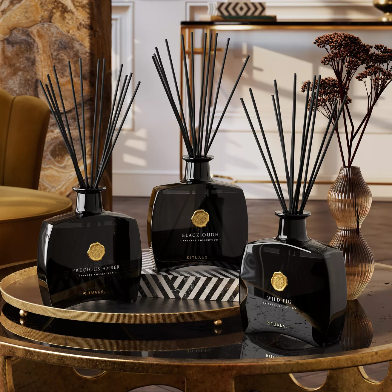 Elegantní flakon z černého skla má kovový, poloprůhledný povrch - je ideálním doplňkem jakéhokoli interiéru, ať už ve vaší domácnosti, nebo jako pozorný dárek. Užívejte si elegantní a výjimečnou atmosféru až po dobu 5 měsíců a kombinujte vonné tyčinky s odpovídající svíčkou, abyste svůj zážitek z vůně ještě umocnili.