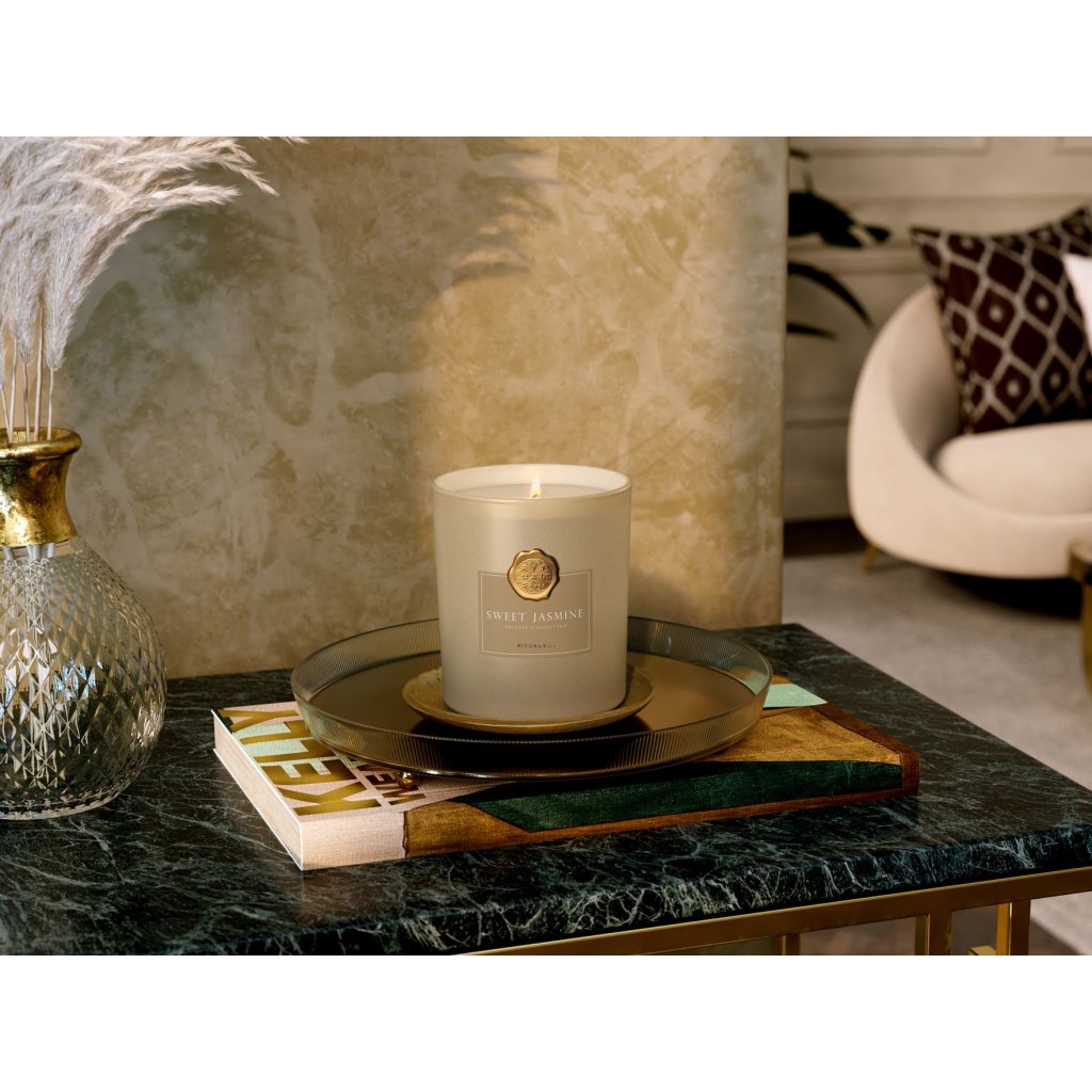 Vytvořte si doma pocit klidu díky svíčce s vůní sladkého jasmínu z naší soukromé kolekce. Jiskřivý a zářivý ovocný vrchní tón čerstvých citrusových tónů a bobulí přechází do elegantních květů, jako je pivoňka a muguet. A santalové dřevo dodává vůni eleganci a hřejivost.
